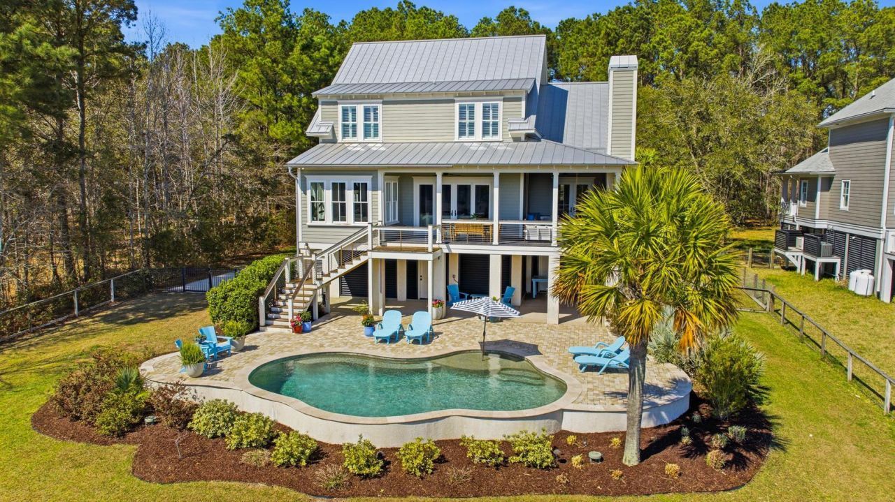 Nestled along the serene banks of the picturesque Awendaw Creek, this exquisite, deep-water property with a private dock and brand new sea wall offers a rare opportunity to indulge in the tranquil lifestyle of coastal living. Whether you love fishing, boating, or just enjoying the natural beauty of the Lowcountry, this home is a world of adventure and relaxation. Set on over an acre of lush, landscaped grounds, this stunning residence greets you with the gentle sway of majestic oaks, setting the tone for the charm that awaits within. Step inside to discover a harmonious blend of modern comforts and timeless Southern elegance.Built in 2016, this elevated home features 4 spacious bedrooms and 3 and a half bathrooms, with a three stop elevator for convenience and effortless access to all levels. The heart of the home lies in its thoughtfully designed kitchen, featuring top-of-the-line appliances, granite countertops, and a cozy breakfast nook that overlooks the water--a perfect spot to sip your morning coffee while watching the sunrise. The master suite is a true retreat, complete with a spa-like ensuite and double doors that open up to stunning water views, promising restful nights and rejuvenating mornings. Venture outside to your private oasis, where a gorgeous pool awaits, inviting you to relax under the Southern sun. The saltwater pool is an all-season retreat, featuring a pebble-finish and a high-efficiency heat pump designed to both warm the water in winter and chill it during the peak of the Carolina summer. Expansive covered decks and porches provide the ideal setting for summer barbecues or evening gatherings under the stars, all while the gentle lapping of water provides a soothing soundtrack to your evenings. For the boating enthusiast, the drive on floating dock offers unrestricted nautical access at all tides to some of the best waterways in the Lowcountry, making it easy to set sail for a day of fishing, kayaking, or simply enjoying the beauty of nature. Located just a short drive from the vibrant culture of Mount Pleasant and the Isle of Palms beach, you can enjoy the best of both worlds--the tranquility of country living and the convenience of suburban life. Grocery stores, restaurants, and shopping are less than 20 minutes away! 7539 Ladys Secret Lane is more than just a property; it's an invitation to experience the quintessential Lowcountry lifestyle. Don't miss your chance to own a slice of paradise in Awendaw--where the water meets Southern charm.